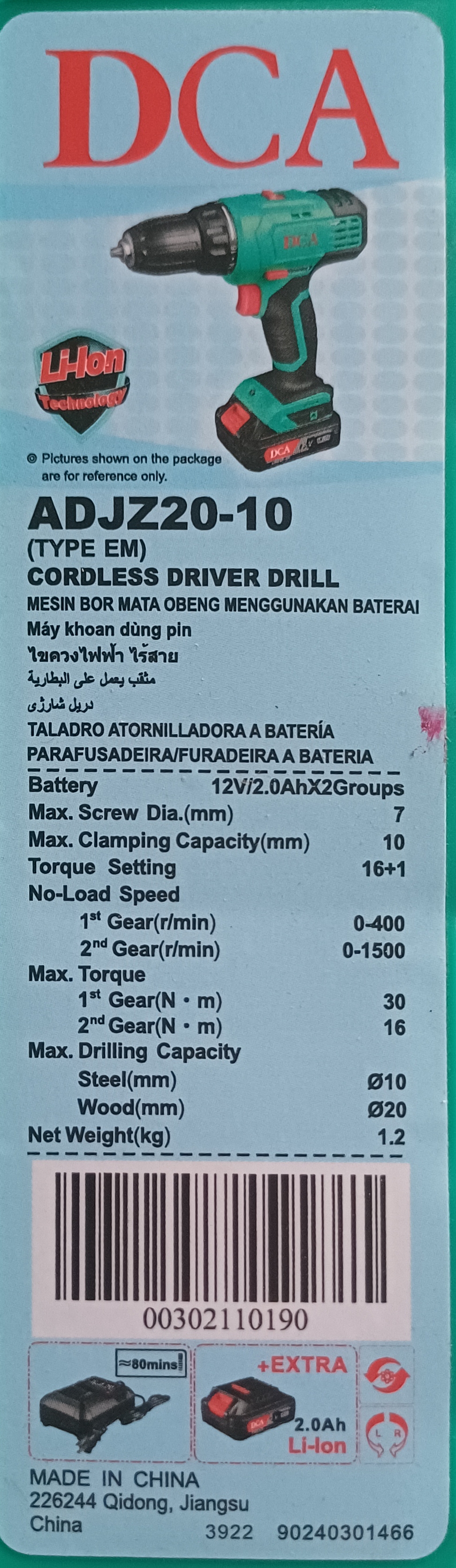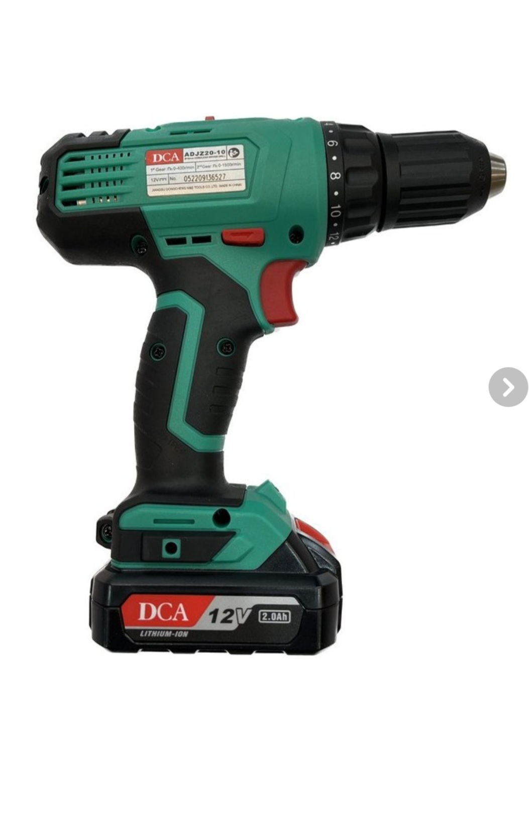 منبع تغذیه دریل شارژی DCA یک عدد باتری 12 ولت لیتیومی 2 آمپر ساعت میباشد که از کیفیت و نگهداری شارژ مطلوبی برخوردار است. همچنین این محصول دارای گیربکس دو سرعته با گشتاور 30 نیوتون متر است. دریل شارژی مدل ADJZ20-10EM مجهز به لامپ ال ای دی (LED) است که بسیار مناسب برای کارکردن در محیط های کم نور یا تاریک میباشد. همچنین این ابزار دارای حالت چپگرد و راستگرد برای باز و بست انواع پیچ است.